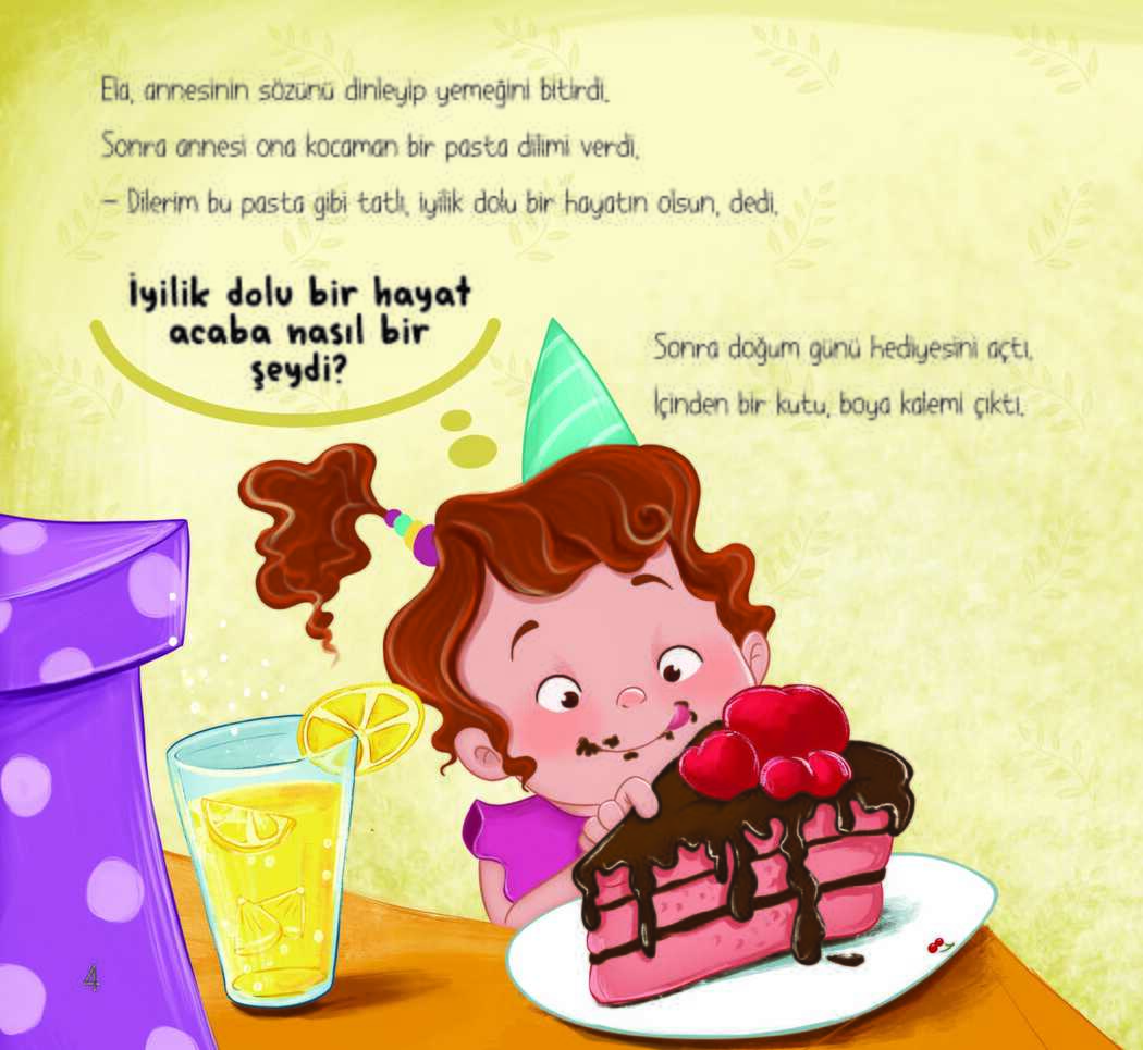 Altı yaşındaki başkahramanımız Ela, iyiliğin gücünü keşfetmek istiyor ancak nereden başlayacağını tam olarak bilmiyor. Derken içinden gelen güzel bir sese kulak veriyor. İyiliğin bu harika sesi, ona arkadaşlık eden bir kuzudan geliyor. Ela, bu iç sesini ve kuzusunu çok seviyor. Aslında içinde var olan bu duyguyu yaymak için kuzusuyla birlikte her olayda iyilik yapmaya koşuyorlar. Sosyalleşmeyi ve doğru davranışları çocuklarına öğretmek, evlatlarını iyi yetiştirmek isteyen ebeveynlere rehberlik edecek sevimli bir hikâye. Ela’nın duygularını ifade etme biçimi, çocukların kahramanlarıyla empati kurarak iç dünyalarını keşfetmelerine yardımcı olacak ve tüm bu karmaşık duyguların içinden iyilik değerini çıkarmalarına olanak tanıyacak harika bir yolculuğu sunuyor.